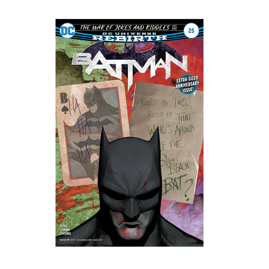 “The War of Jokes and Riddles” part one! Don't miss this extra-sized anniversary issue! In his own words, Bruce Wayne narrates a harrowing, never-before-told story of the Dark Knight's greatest failure…and the horrors it unleashed! In the spirit of YEAR ONE and THE LONG HALLOWEEN, prepare to see a side of Batman you've never seen before—get in on the ground floor of a classic Batman epic in the making!