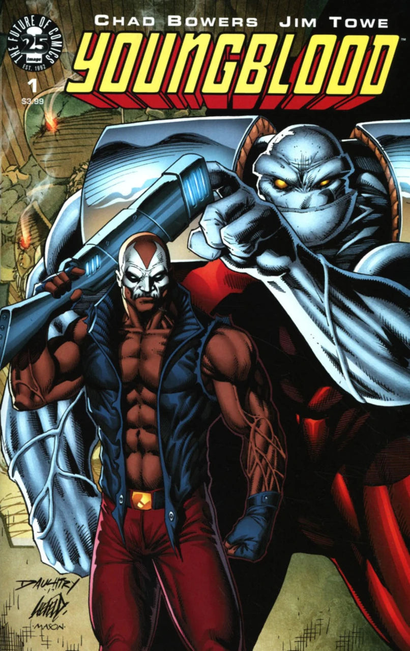 25 years ago, YOUNGBLOOD launched the Image Revolution and turned the comics world on its head! Now the original blockbuster hit series returns with an all-new cast and a brand-new mission! When a young hero goes missing, his friend's search for answers leads to some unexpected allies. Together, they'll do whatever it takes to find him…even if it means resurrecting the world's most infamous super-team. Gear up, strap in, and get ready to rediscover comics' most extreme universe with creators CHAD BOWERS (X-Men '92, Deadpool: Bad Blood) and newcomer JIM TOWE!