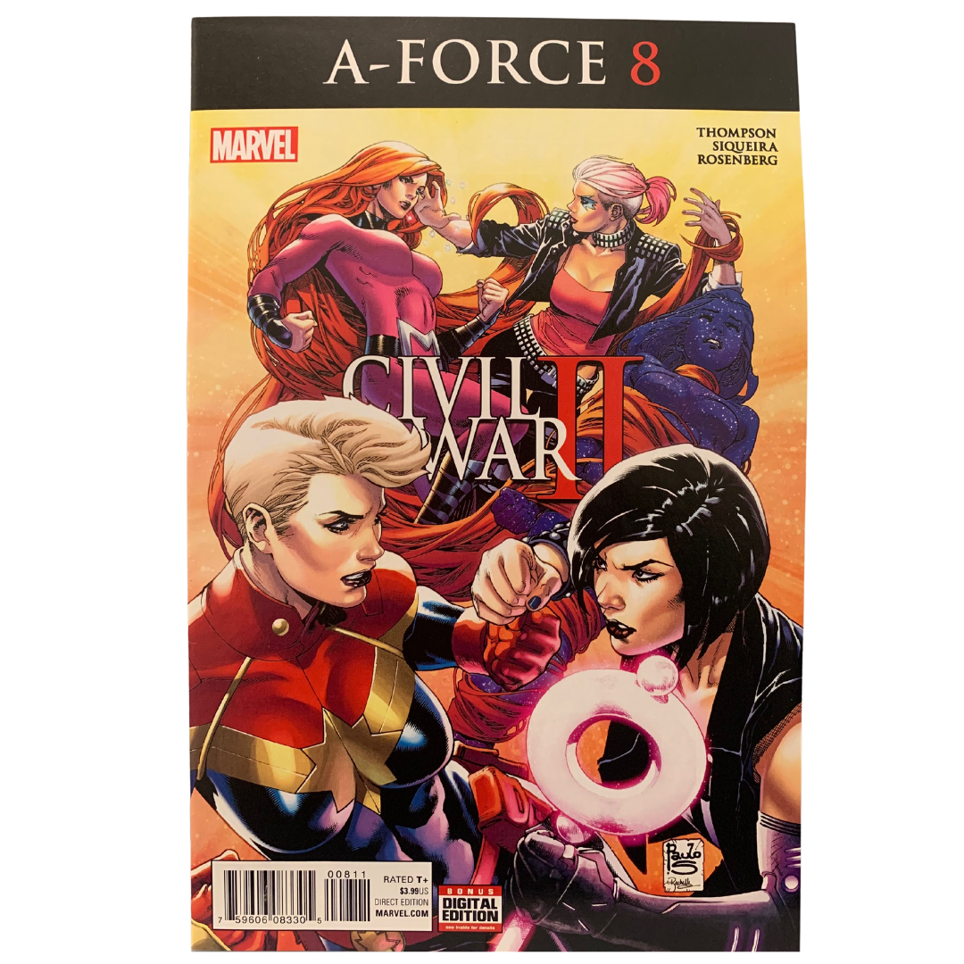 CIVIL WAR II TIE-IN! NEW SERIES ARTIST PAULO SIQUEIRA STARTS HERE! Civil War has come to A-FORCE! As the team is wrecked by a personal tragedy things only get worse when a predictive vision proclaims one of A-FORCE is a murderer. CAPTAIN MARVEL attempts an arrest, creating a rift that may very well mean the end of the team, and setting in motion a chain of devastating events that affect far more than just A-FORCE. Meanwhile foul-mouthed, gun-toting ELSA BLOODSTONE just unofficially joined A-Force. Looks like we're gonna need a bigger boat...and a verrrrry big black censor bar.