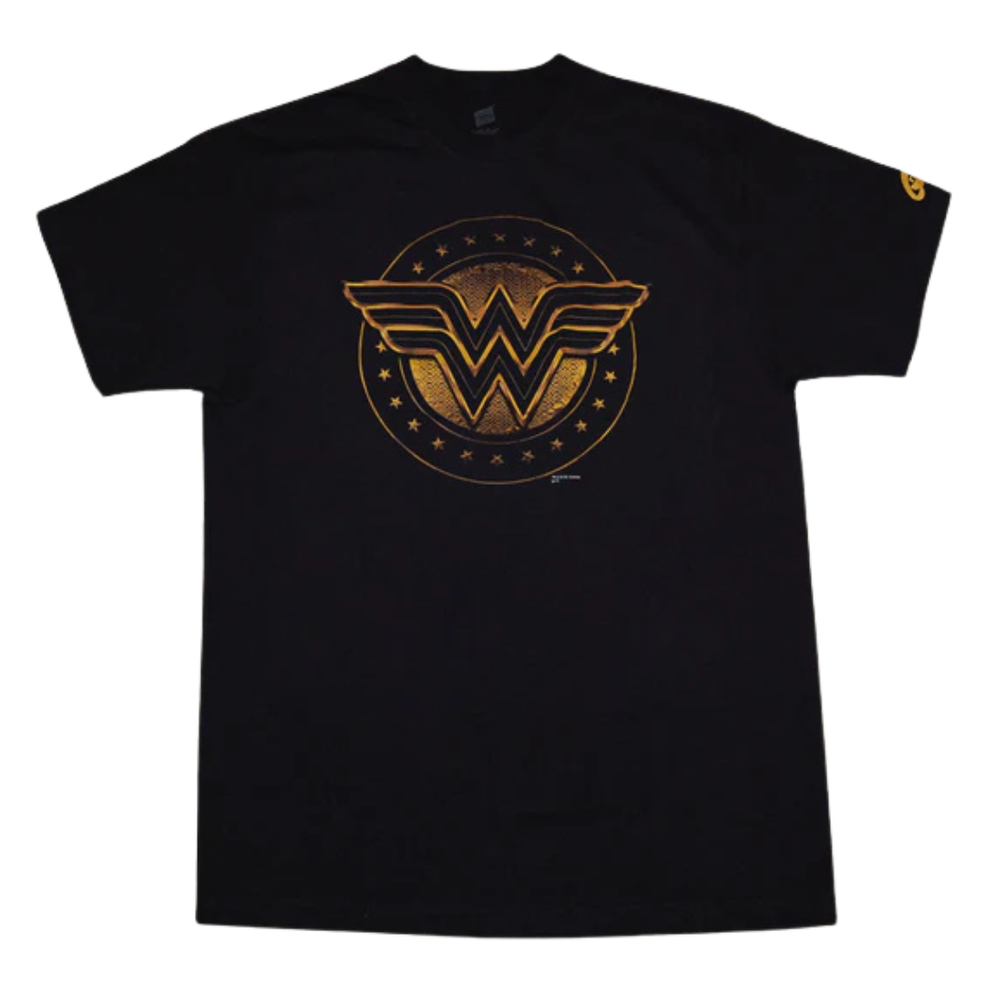 DC Wonder Woman Gold Logo : Black crew neck Tee Shirt. 100% Cotton officially licensed.